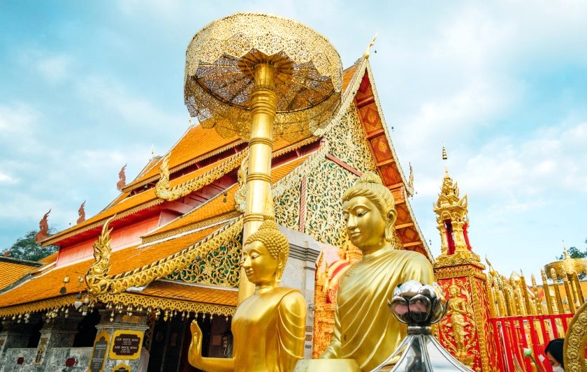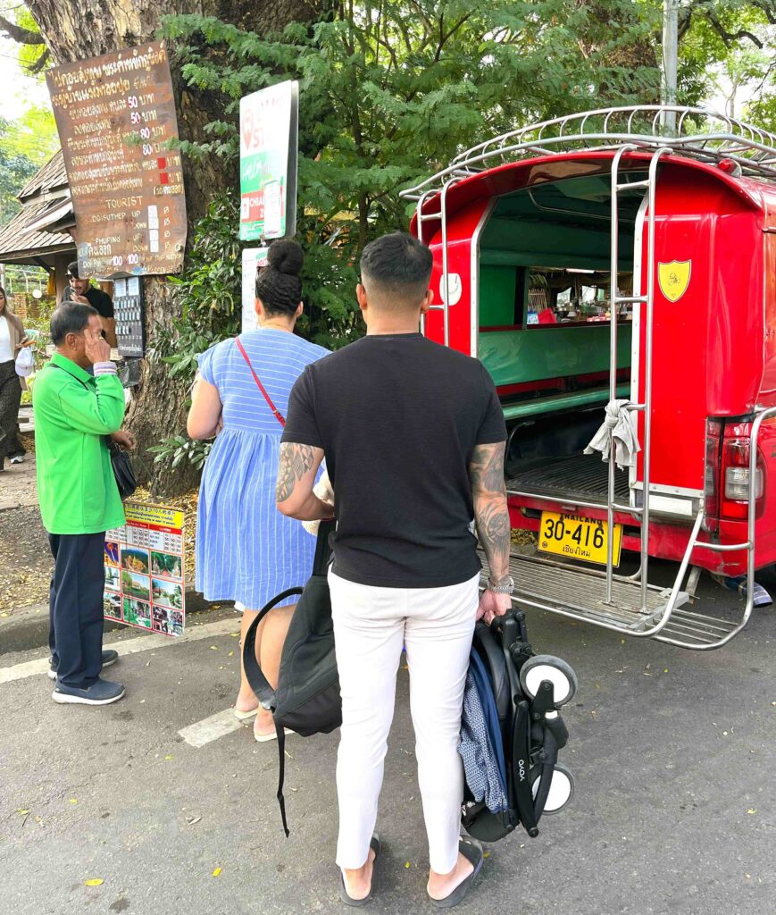 De volgende dag een bezoek aan de tempel in de bergen: Doi Suthep. Met de auto naar een punt gereden waarvandaan je makkelijk met de songthaew (Thaise taxi) naar de tempel wordt vervoerd. Het was heel druk daar boven.