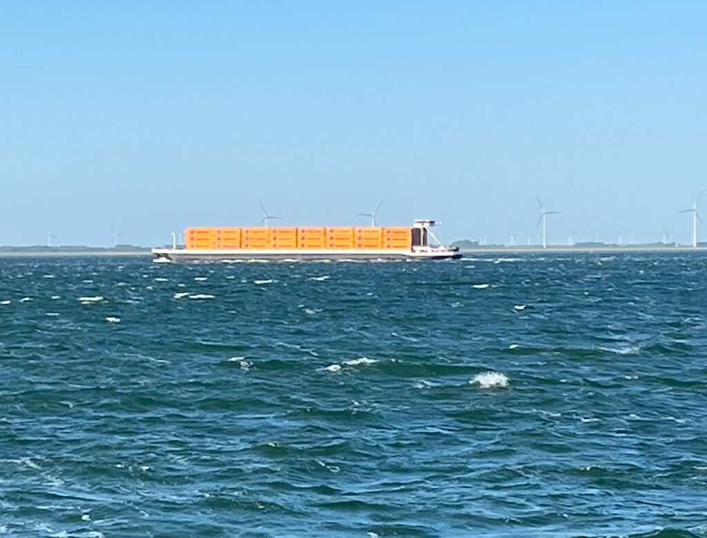 Op het water is ook altijd wel wat te zien. Dagelijks varen er binnenvaartschepen met containers aan boord voorbij, maar gisteren kwam er een heel bijzonder containerschip langs. Op afstand leek het wel een varend huizenblok.