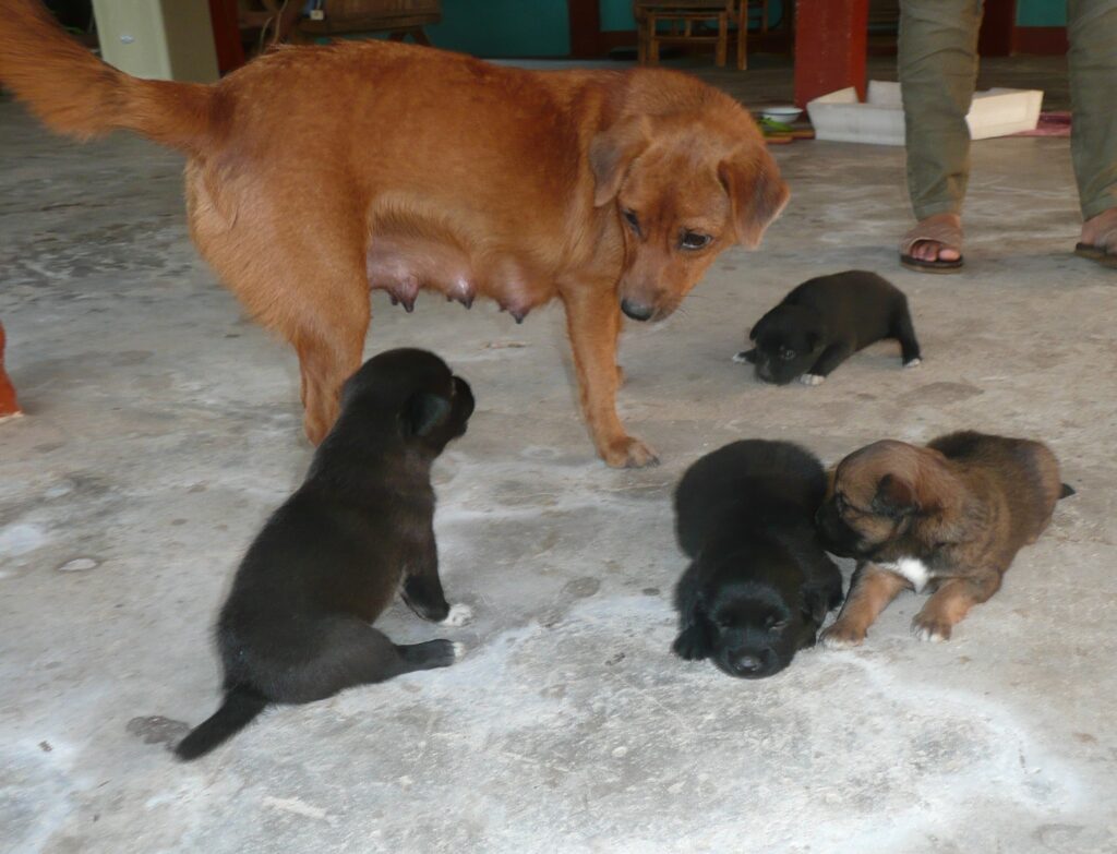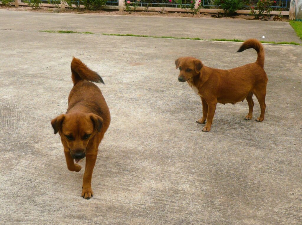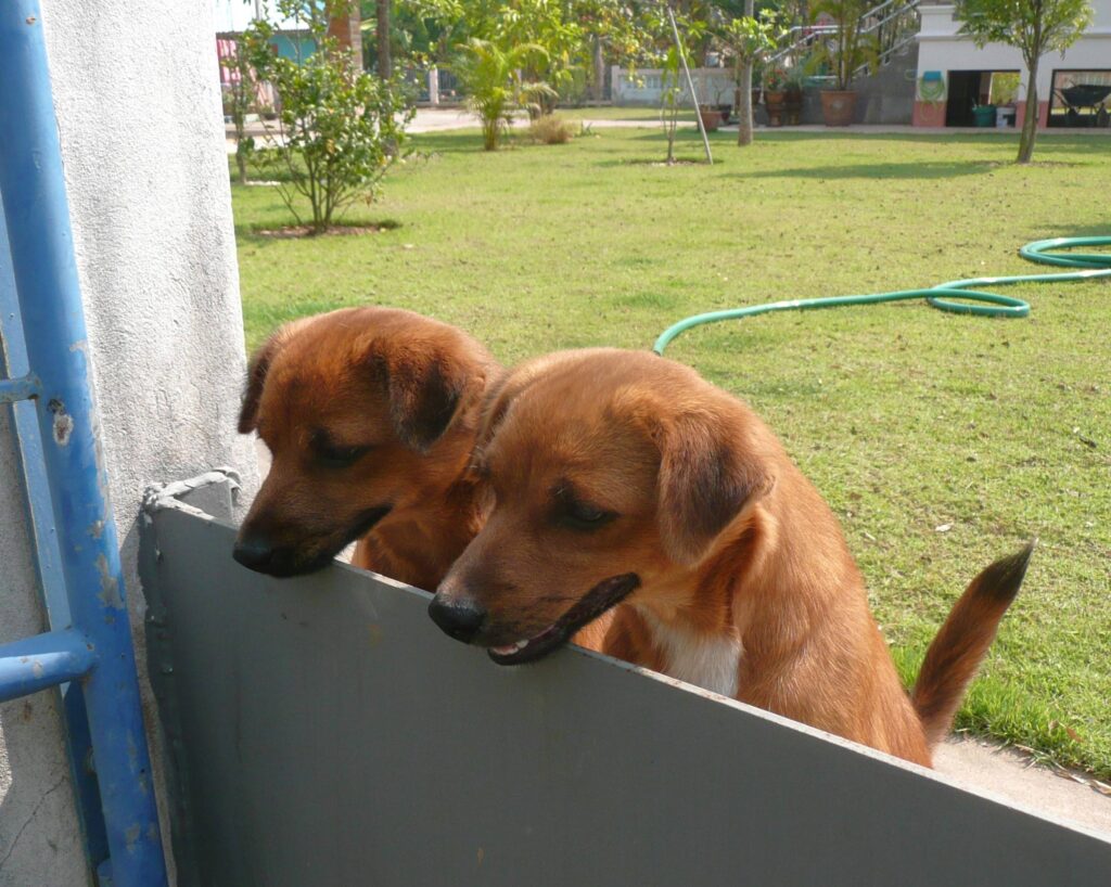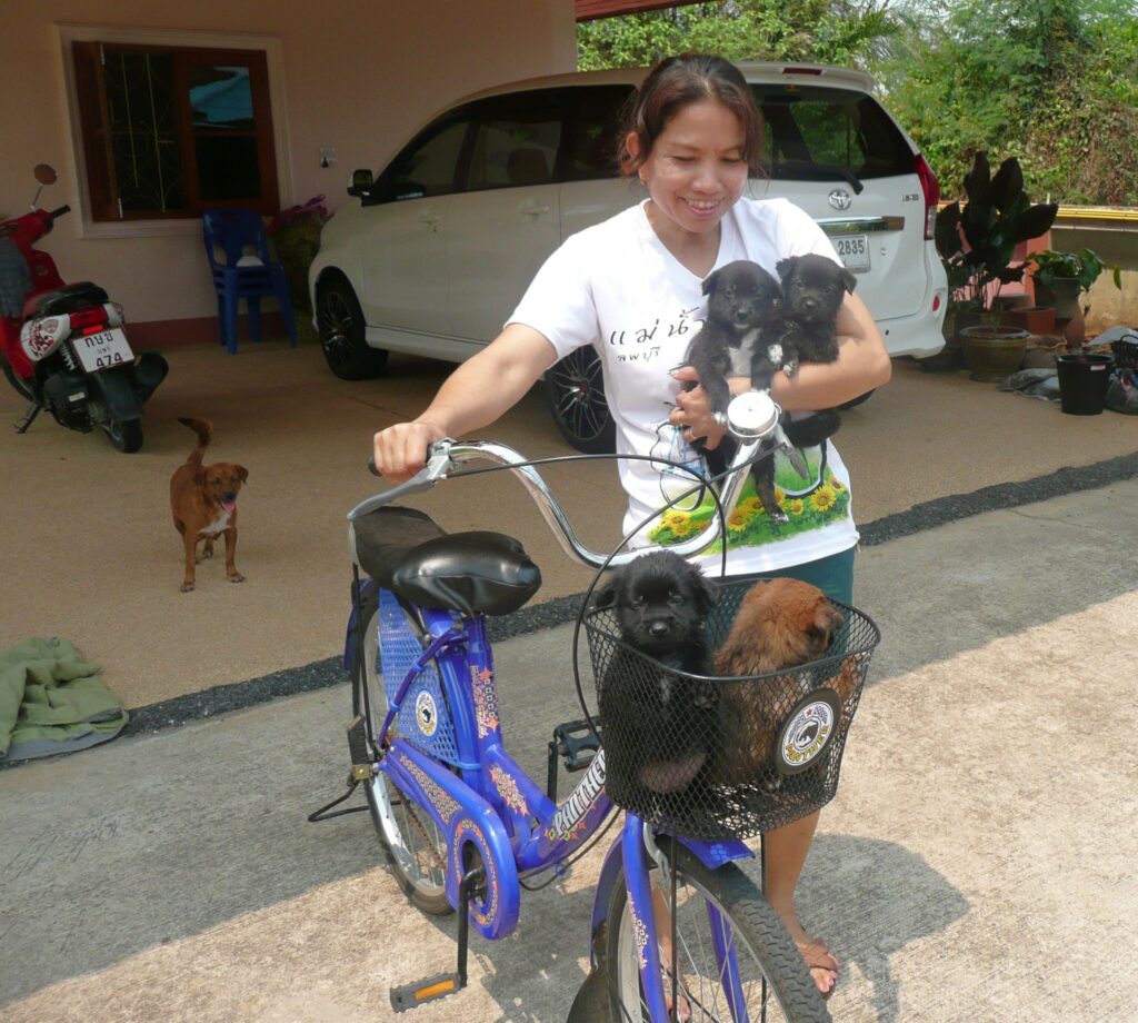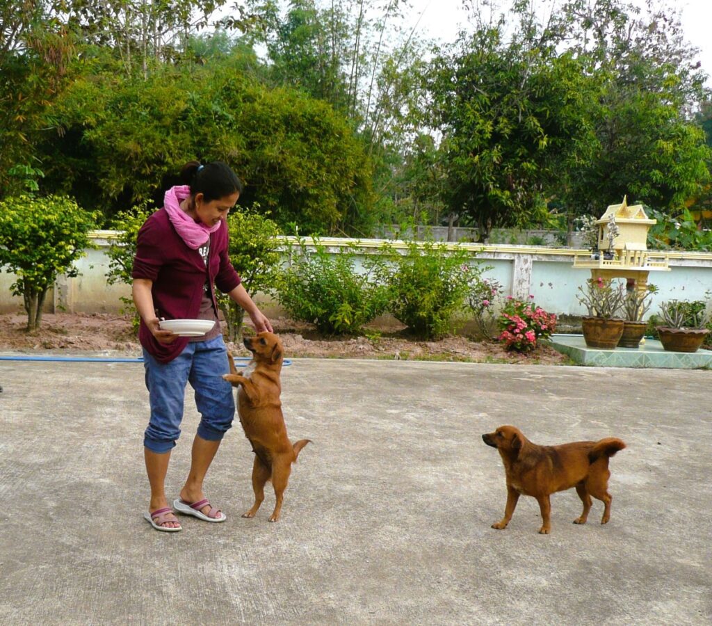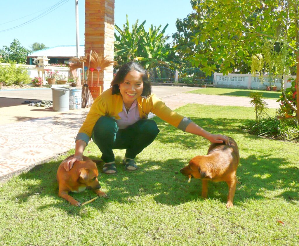 In 2009 kwamen Poem en Poej in de familie. Twee hondjes, vrouwtjes, die de vader van Soj gezelschap gingen houden. Als wij in Thailand waren zorgde Soj voor de hondjes. Dat ging makkelijk, onze oprit ligt naast het huis waar Soj is geboren en waar ‘opa’ nog steeds woonde. Poej was de bijdehandste van de twee, wilde altijd spelen en overal bij zijn. Zusje Poem was rustig. Poej bleek op een gegeven moment in verwachting, in maart 2014 werden er 4 puppy’s geboren. Die vonden al snel een nieuw thuis. Poej bleek een paar jaar later ongeneeslijk ziek en is op 8 jarige leeftijd gestorven.