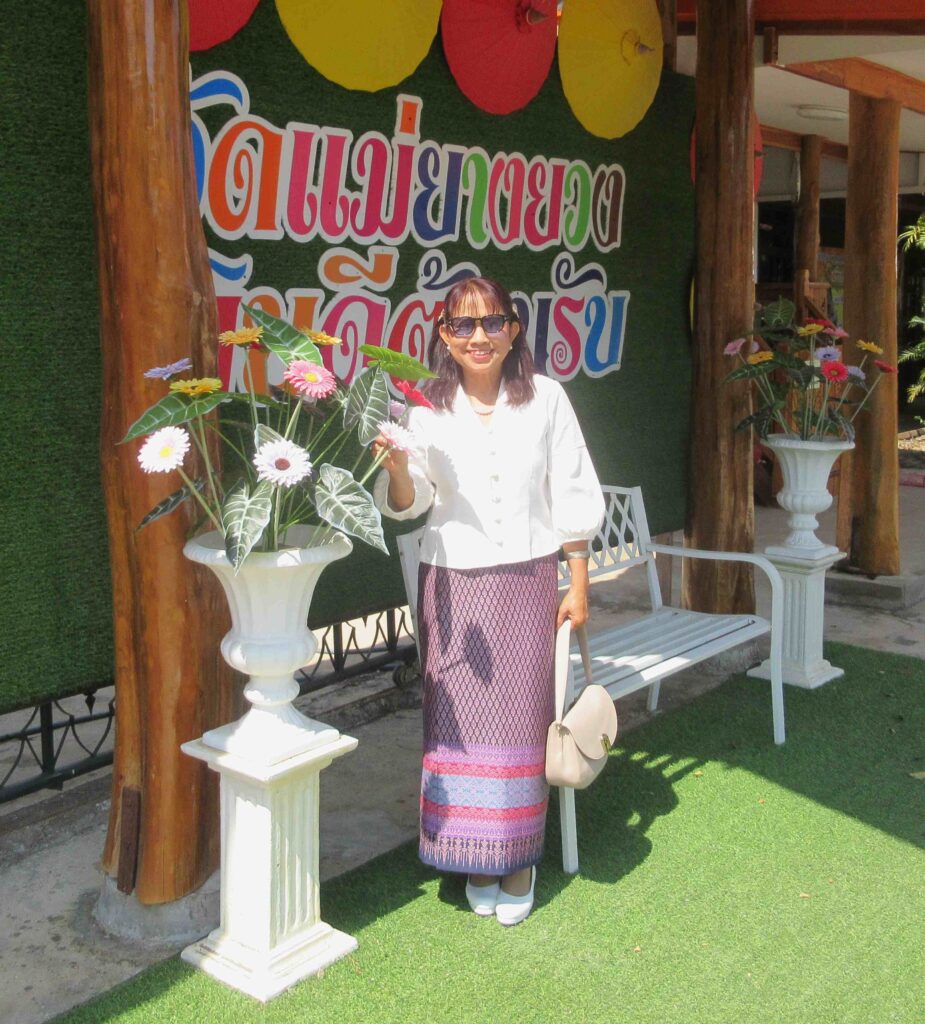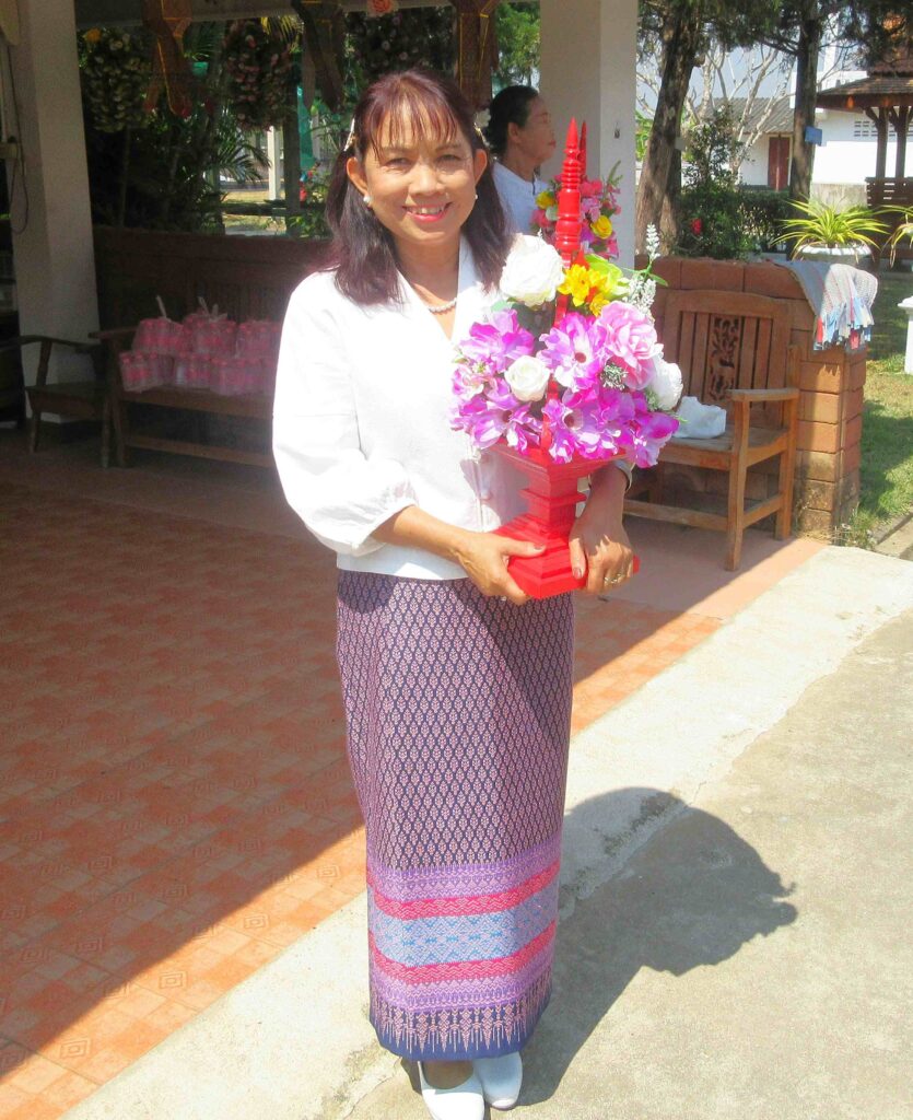 Deze week was er weer een speciale Boeddhadag. Dat betekent dat er in veel tempels feest wordt gevierd. Niet in onze tempel, maar een delegatie van het dorp ging wel naar 9 andere tempels in de provincie Phrae. Tenminste dat was de bedoeling. Soj was al vroeg op pad met een groepje, in onze auto. Eind van de middag kwam ze de poort weer binnenrijden. Na 7 tempels vonden de dames het wel genoeg. Ik heb ‘s-ochtends foto’s gemaakt van Soj en enkele van de traditioneel geklede deelnemers. Mooi hoor.