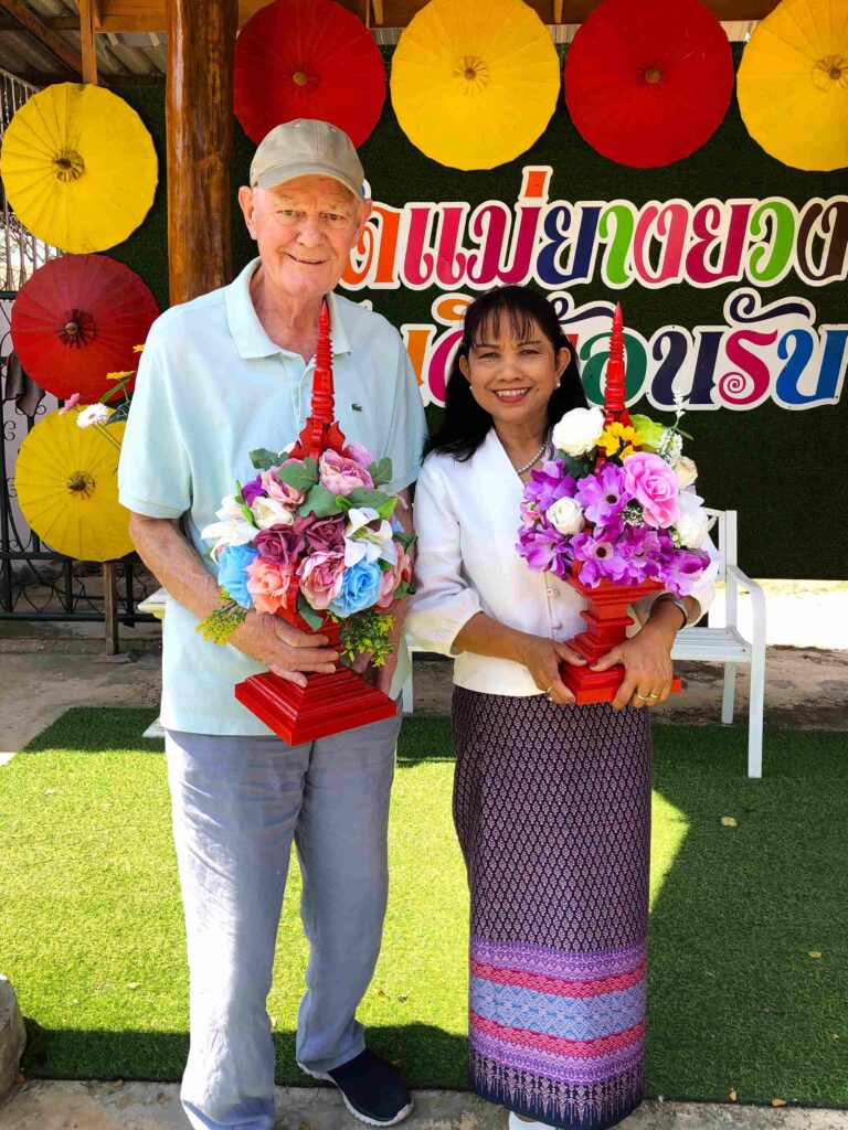 ‘s-ochtends, voor vertrek, wij samen op de foto met bloemstuk.