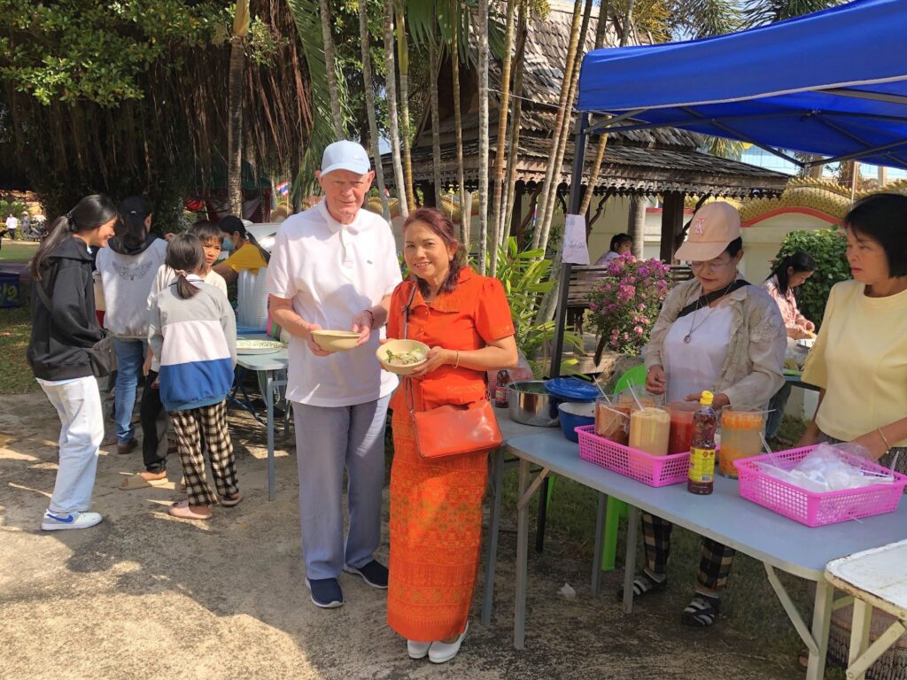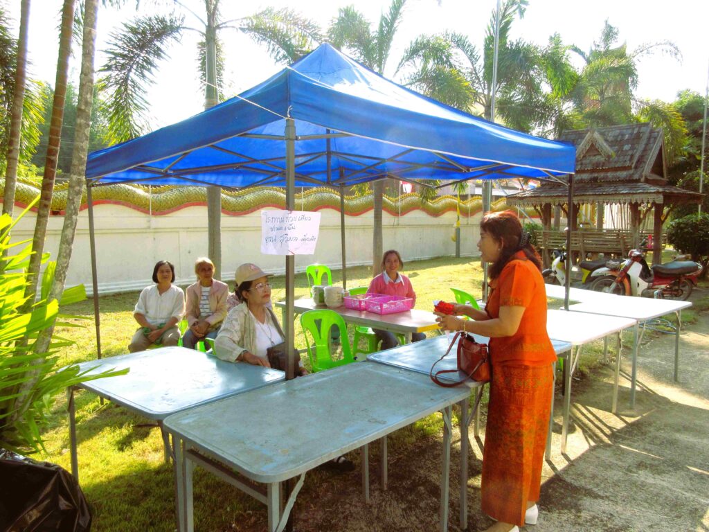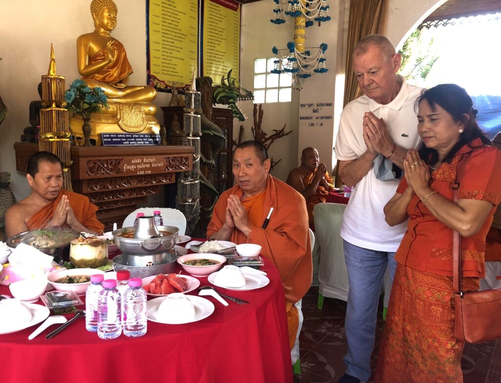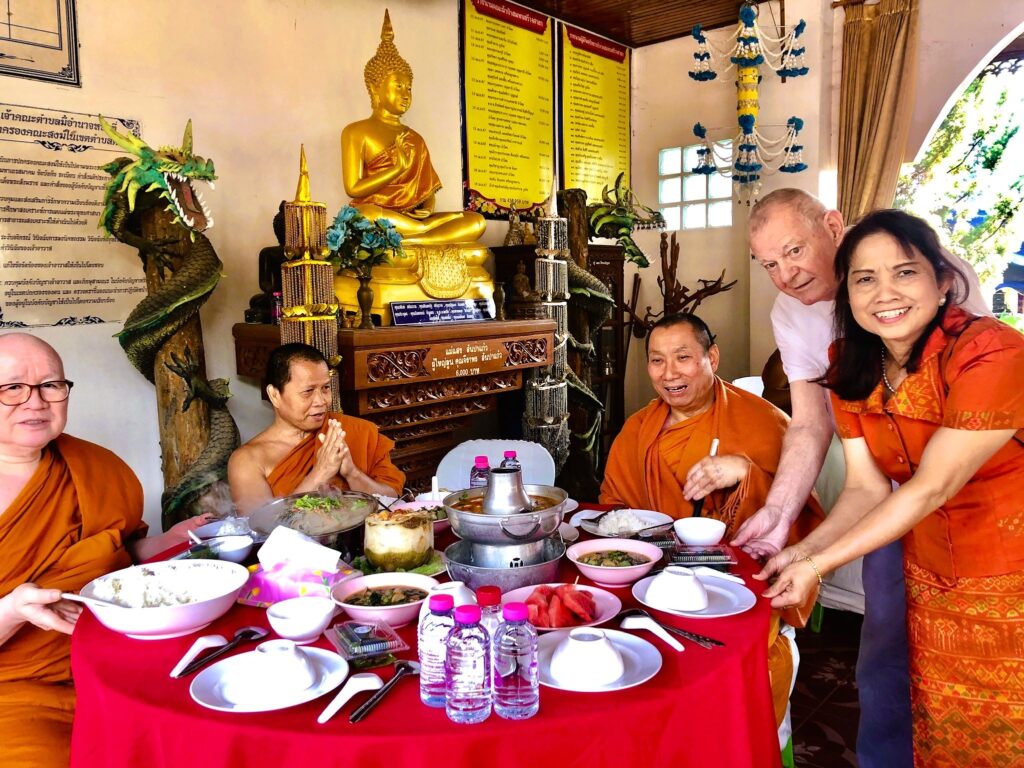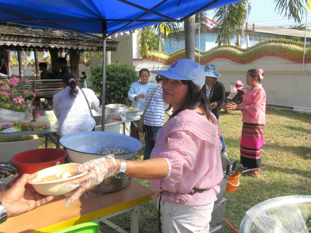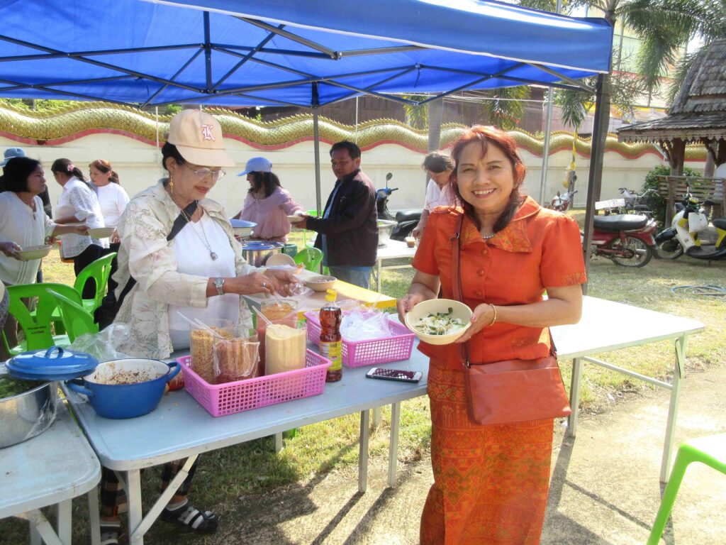 Zondag was er feest in de tempel van Mae Yang Yuang. Het feit dat er een nieuwe monnik is aangesteld voor de tempel werd uitgebreid gevierd. Bovendien was hij ook nog eens jarig op die dag. Dus dubbel feest. Er waren heel veel monniken gekomen om dat te vieren. Wij hebben het feest uitgebreid ondersteund door te zorgen voor: het eten voor de monniken, het optreden van een traditionele muziek- en zanggroep en een etenstentje met gratis eten en drinken. Ook andere inwoners van het dorp hadden etenstentjes geïnstalleerd. Het was de hele dag feest tot 10 uur ‘s-avonds.