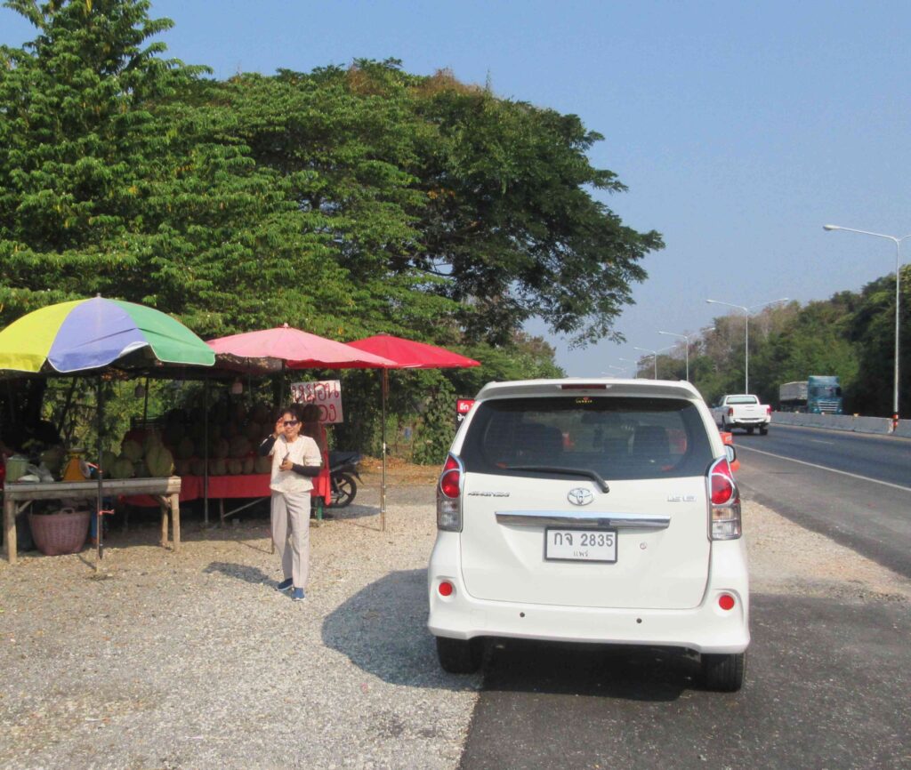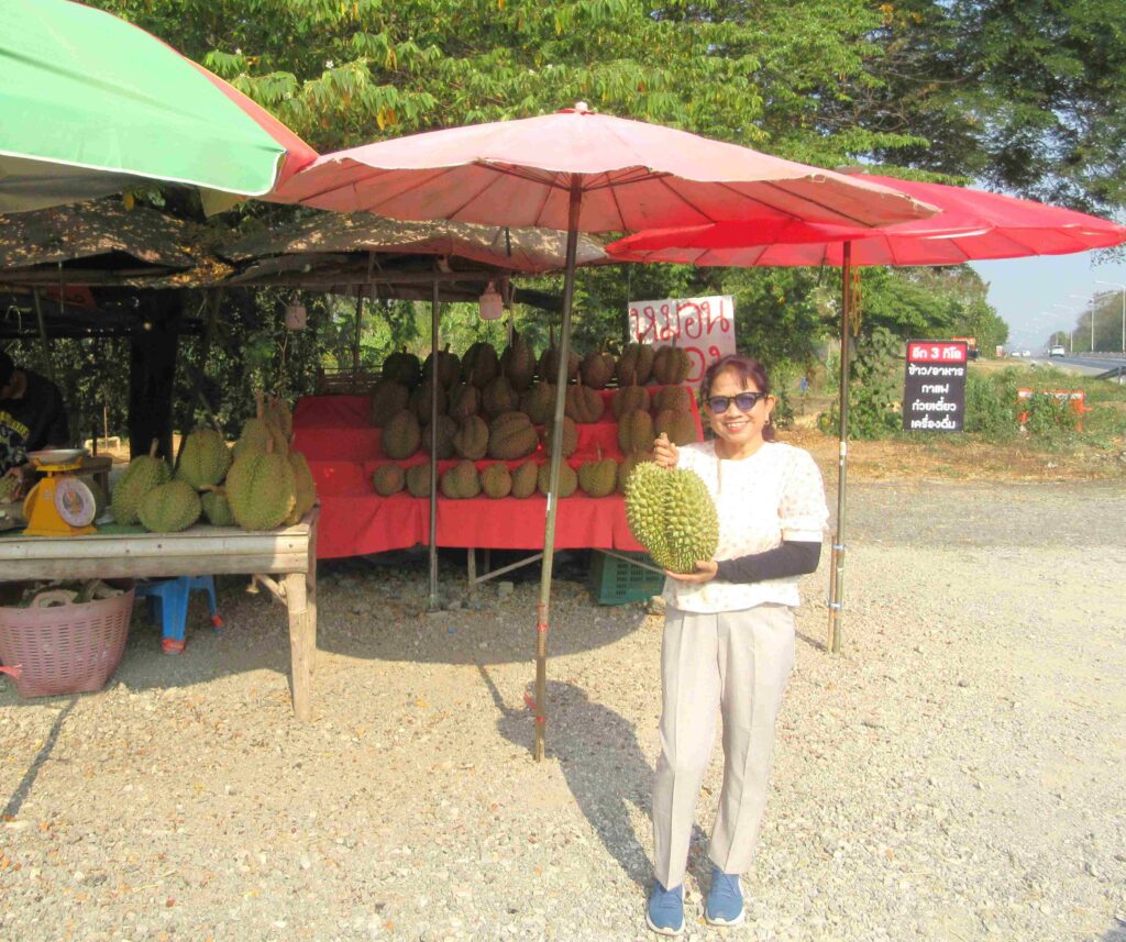 Na het eerbetoon aan deze dappere Uttaraditse strijder verder gereden en langs de highway nog even gestopt om durians te kopen. Uttaradit is een provincie waar veel fruit groeit en staat bekend om zijn durians. Een bijzonder vrucht, veel Thaise mensen vinden hem heerlijk, ik vind het niet te eten. Bovendien heeft de durian een hele penetrante geur, reden waarom het verboden is om durians mee te nemen naar een hotel. Maar voor de liefhebbers moesten we dus even stoppen om inkopen te doen. En in ons dorp hebben we weer mensen blij gemaakt met deze lekkernij.