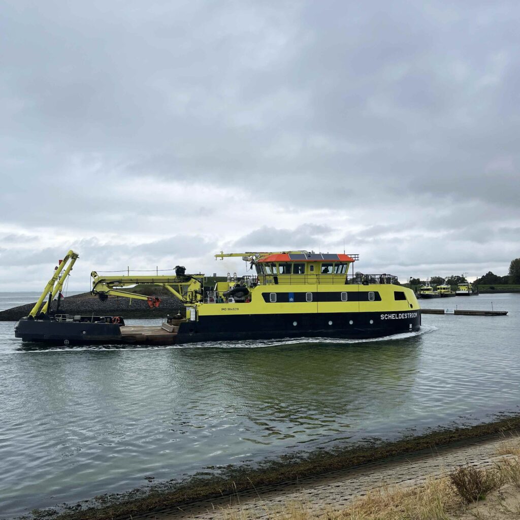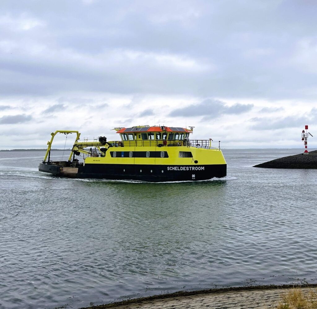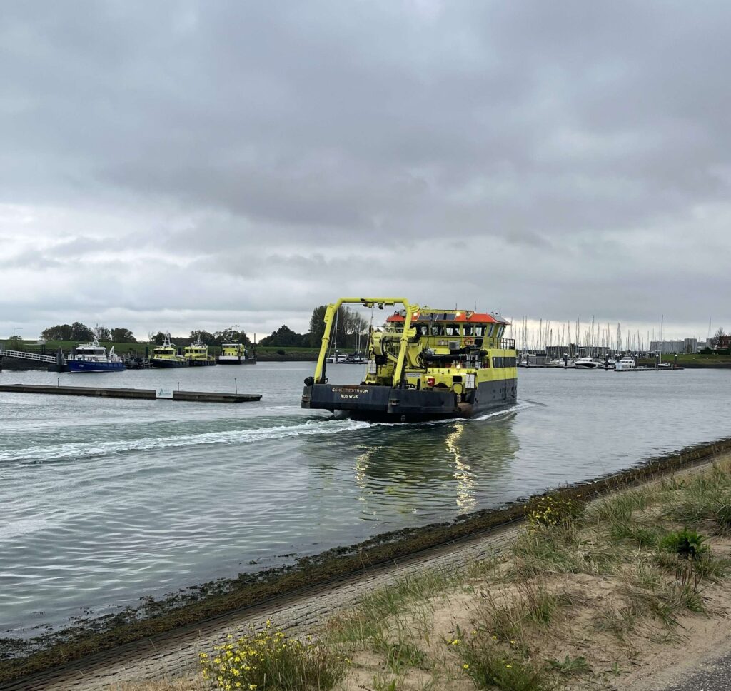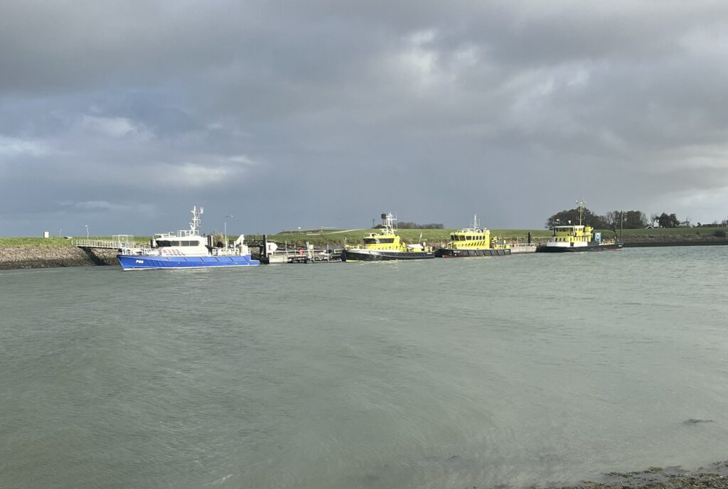 Maar vorige week kwam er, tijdens mijn rondje over de dijk, een bijzondere boot van Rijkswaterstaat de haven binnen varen. Nog nooit eerder zo’n vaartuig gezien. Volgens mij een heel modern schip. Kwam blijkbaar even op bezoek bij z’n collega’s. De volgende dag heb ik het gevaarte niet meer gezien.