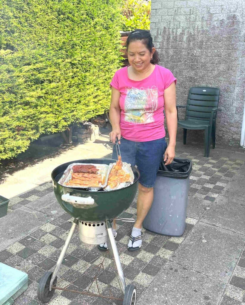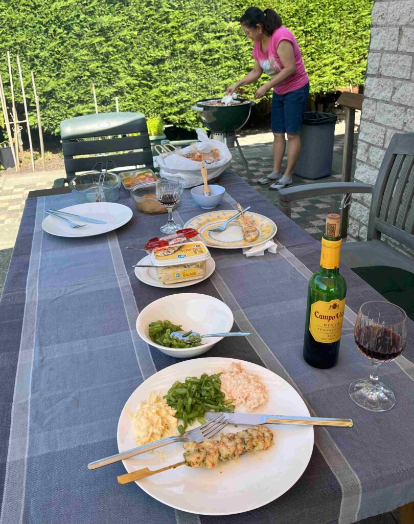 De kok aan het werk. De bbq is goed gevuld, teveel om in één keer op te maken. We eten er nog heel de week van.
